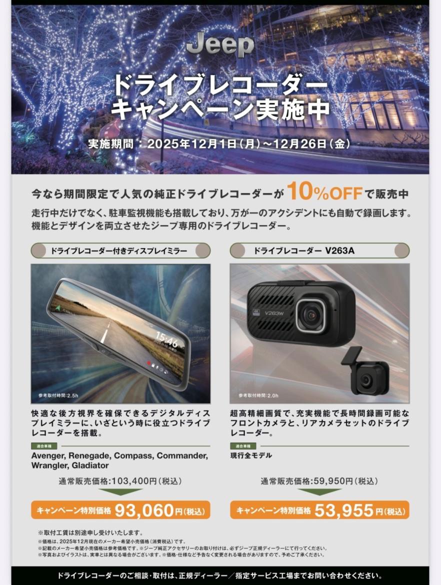 全国のジープ正規ディーラーにて、2025年12月1日(月)〜12月26日(金) の期間限定で、人気のドライブレコーダーが 10%OFF でご購入いただけます。